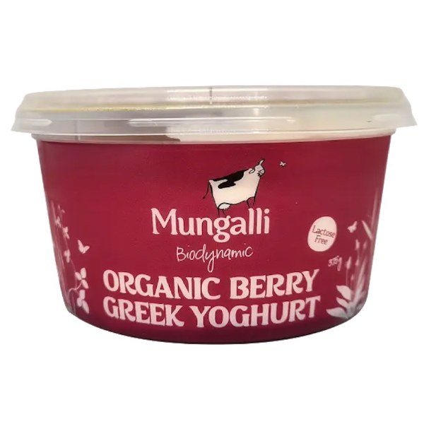Mungalli Berry Bliss Greek Yoghurt is made from full cream biodynamic milk and organic mixed berries. Handcrafted the old fashioned way and strained through cheesecloth, this Greek-style yoghurt is rich, thick and creamy. Lactose free and gently sweetened, it delivers a smooth, decadent texture with a fresh berry finish.